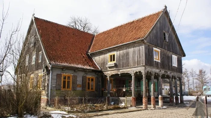 Szczyt północny wykonany jest z czerwonej cegły, więc do budynku przylegała część gospodarcza.