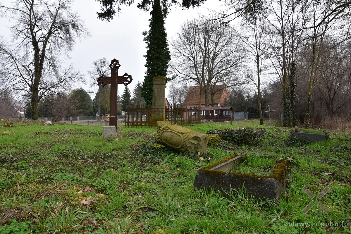 Z cmentarzem związany był, zlokalizowany około 200 m na wschód od domu podcieniowego, kościół ewangelicki z wolno stojącą, drewnianą dzwonnicą. Hartwich datuje budowę najstarszego budynku kościoła na rok 1619. Został on przebudowany w 1669 r. W latach 1707-1708 kościół został przebudowany przez cieślę Jacoba Tefnera. W latach 1720-1721 pomalowano sufit kościoła, bez zakrystii (powód: pijany malarz). W 1746 i 1747 r. kościół z zewnątrz oszalowano. W roku 1841 r. obiekt był remontowany i odmalowano wnętrze, a rok później dokonano drobnych napraw wyposażenia. W 1903 r. zakupiono odlewane, stalowe dzwony i w tym celu parafia, obok bramy kościelnej zbudowała drewnianą dzwonnicę. W latach 1904, 1906 i 1908 wnętrze odrestaurowano i ocieplono, a malowidła sufitowe, które wcześniej pobielono, zostały odkryte i odrestaurowane przez malarza Fahlberga. Przedstawiały one serię okrągłych obrazów osadzonych w chmurach i głowach aniołów. Kościół o wymiarach 22,4 na 12,05 m zbudowany był z desek i kryty dachówką. Do strony północnej przylegała kruchta, a do wschodniej zakrystia. Empory zajmowały północną, wschodnią i zachodnią część wnętrza, sufit był beczkowaty, oszalowany deskami. We wnętrzu dominowało barokowe wyposażenie. W latach 50. XX w. kościół rozebrano. Z kościoła zachował się ołtarz, który prawdopodobnie znajduje się w elbląskim kościele pw. Błogosławionej Doroty z Mątów Wielkich, przeniesionym ze wsi Kaczynos.