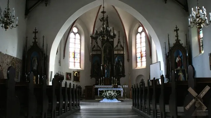 drewniane wyposażenie kościoła oraz cztery dzwony (w tym dwa z XVI wieku). Po szybkiej odbudowie w latach 1897-1898,