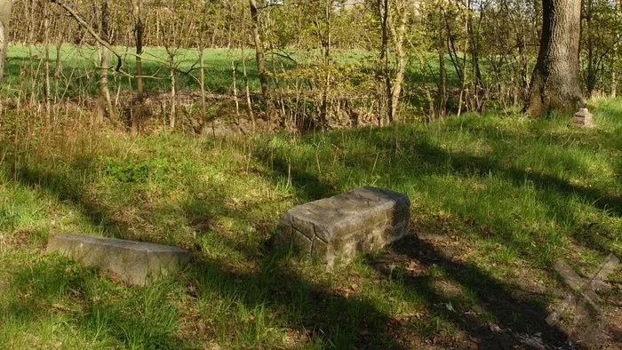 Szczątki starego cmentarza znajdują się w południowej części wsi, wśród drzew.