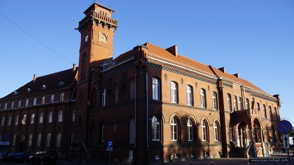 Budynek wzniesiony w latach 1893-1895 przy Pl. Słowiańskim (Danziger Platz) wg projektu Reimera i Körtego z Berlina, kierowany przez berlińskiego architekta Richtera. Gmach w kształcie litery „L”, zdobiony ryzalitami, blendami, sterczynami i małym podcieniem przy wejściu głównym. Boczna część budynku przeznaczona była na stajnie i pomieszczenia gospodarcze.