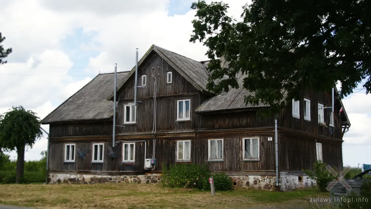 układ pomieszczeń, oryginalny, zdobiony piec kaflowy i drewnianą szafę z 1858 r. Dom, od drugiej strony posiada
