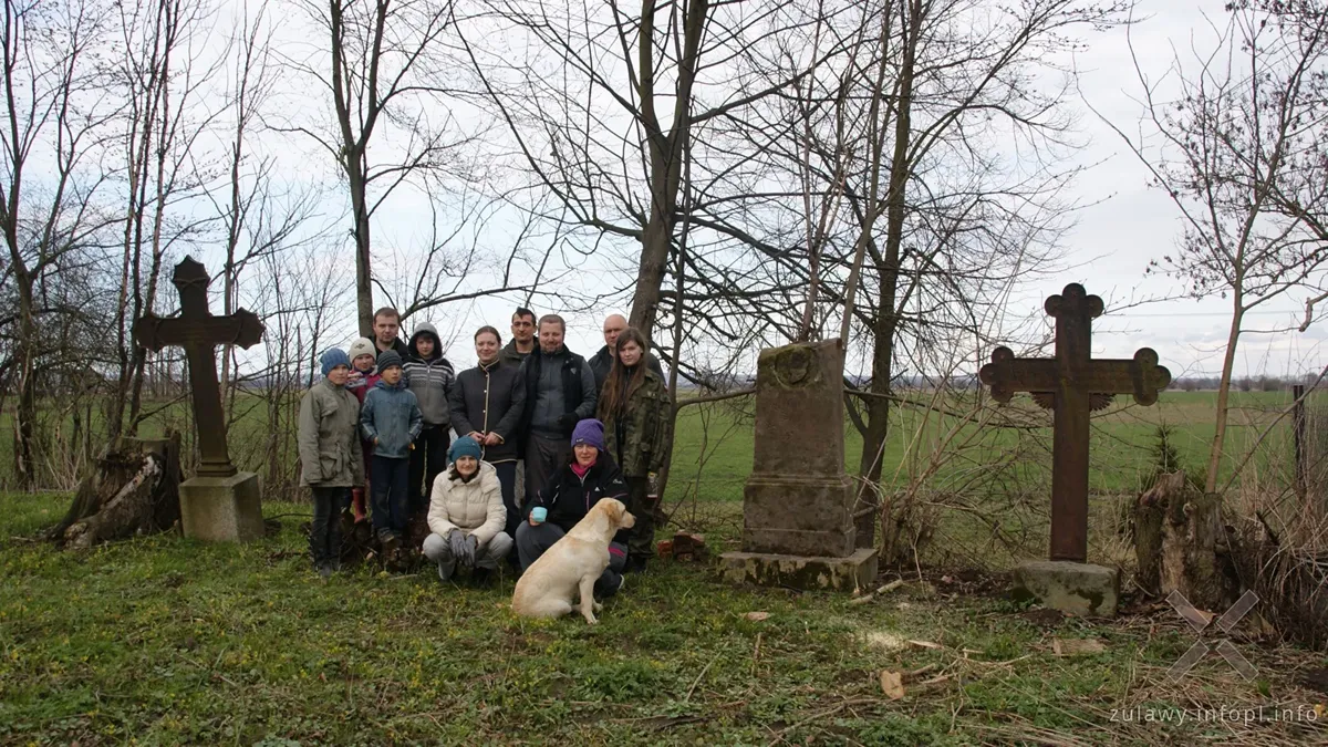 Uczestnicy akcji społecznej w Jasionnie na tle nagrobków.
