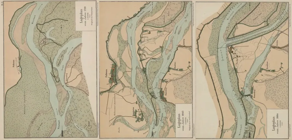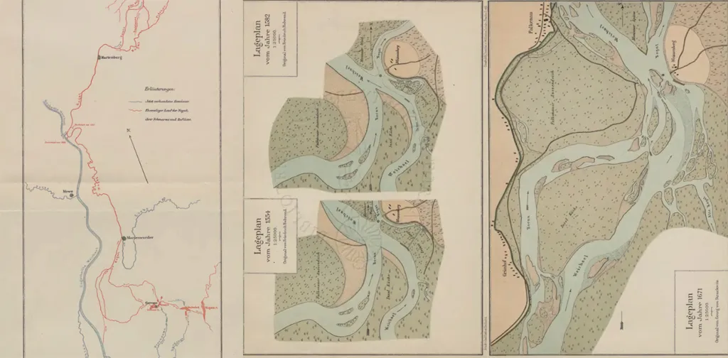 H. Bindemann w książce "Abzweigung der Nogat von der Weichsel" przedstawił szereg mapek przedstawiających
