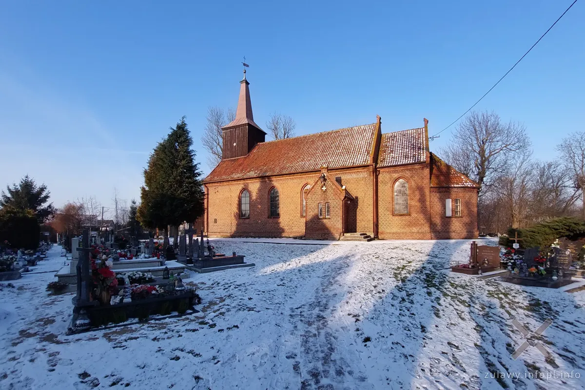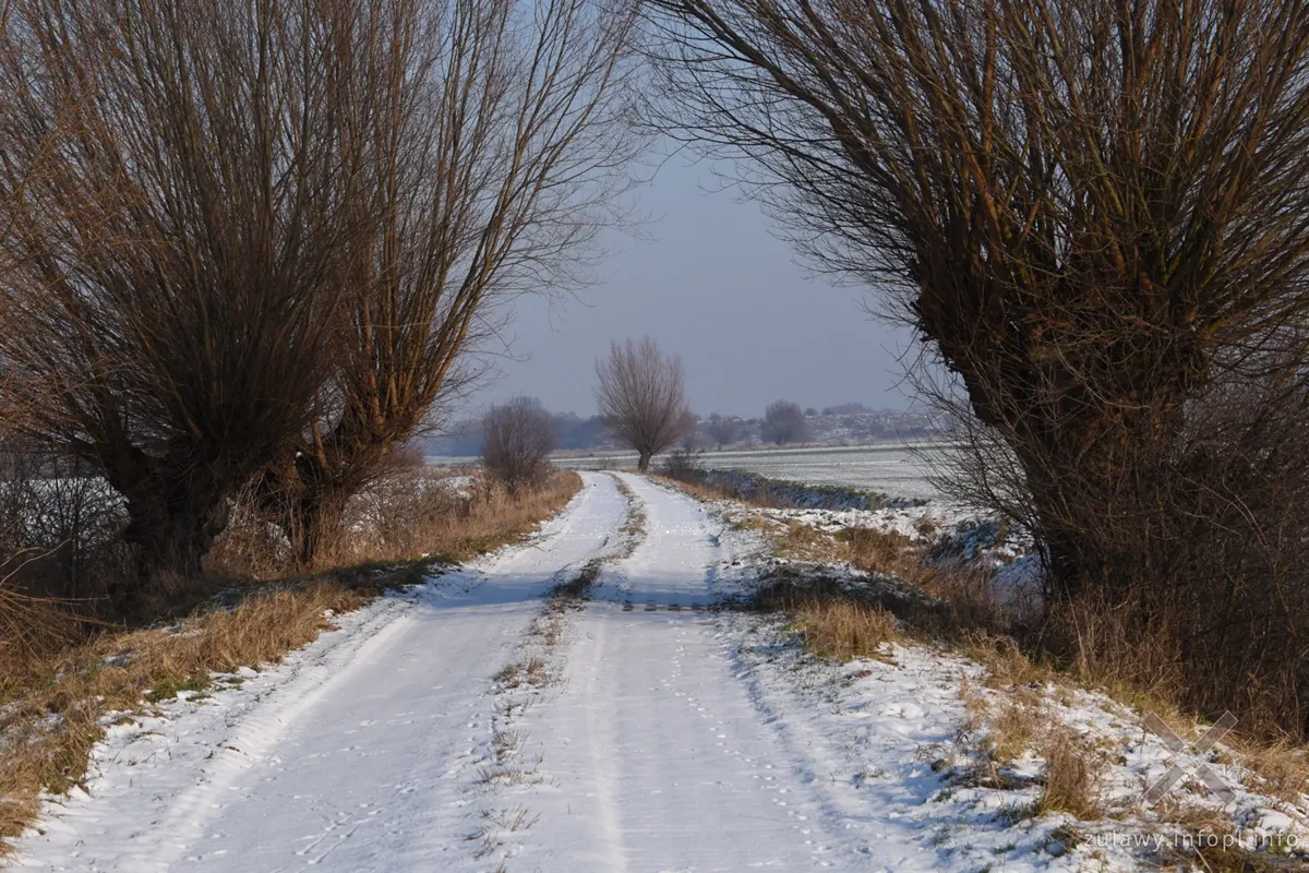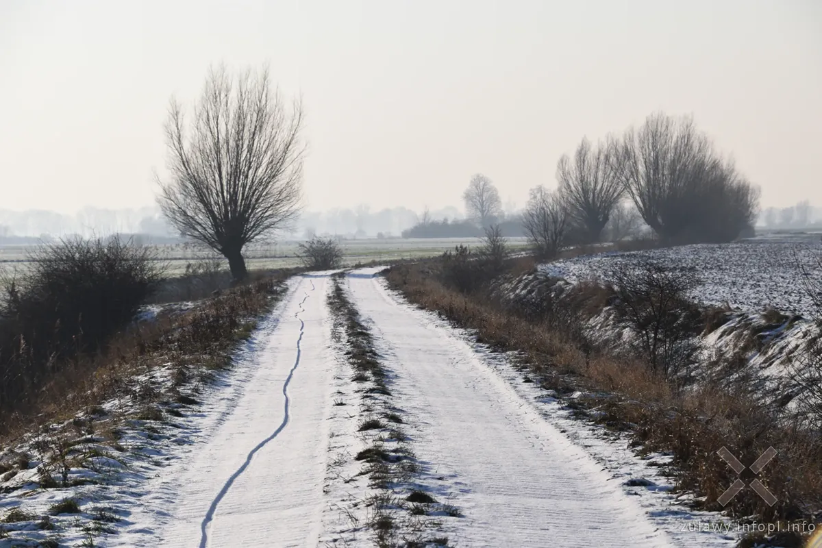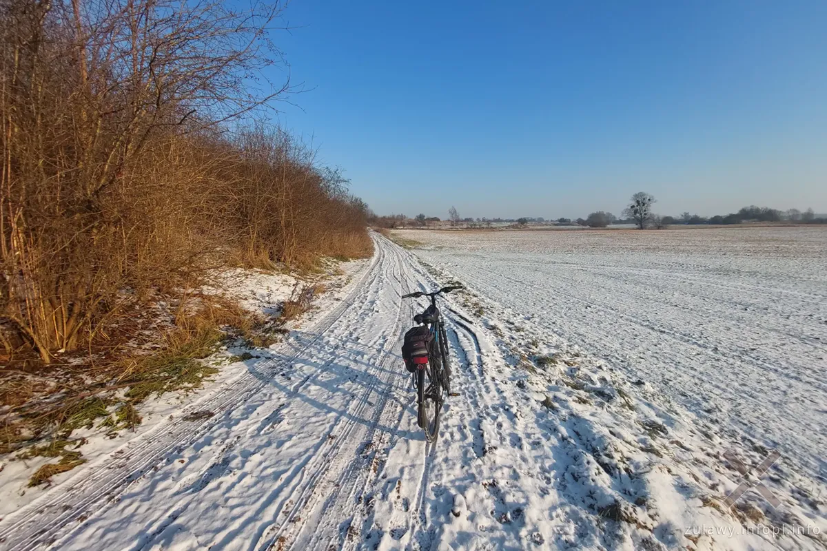 Śniegu na Żuławach nie ma zbyt wiele i jest on świeży. W niektórych miejscach przeważa nawet zieleń na polach. Drogi polne wszędzie pokryte są niewielką warstwą białego puchu, a po śladach na wielu drogach stwierdzić można, że przede mną były tam tylko zwierzęta. To bardzo dobre, zimowe warunki na jazdę drogami polnymi. Trzeba jednak uważać na przymarznięte, ukryte pod śniegiem kałuże, czasem sporej wielkości, które po najechaniu rowerem wydają nieprzyjemny trzask. Zamarzniętą pod śniegiem wodę dało się jednak odróżnić od suchej nawierzchni, więc wystarczyło dobrze patrzeć pod koła. Gorzej z drogami utwardzonymi, lokalnymi, na których miejscami mamy lodowiska w dosłownym znaczeniu. Trzeba więc było zachować szczególną ostrożność, jechać powoli i jeśli tylko pojawiała się taka możliwość, wykorzystywać zaśnieżone pobocza.